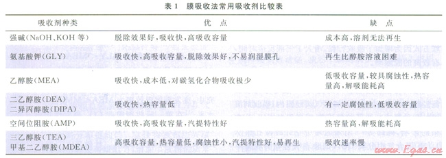 表1為常見的膜吸收法中CO2吸收劑的吸收與解吸性能。其中CO2吸收性能排序?yàn)?span lang="EN-US">NaOH>GLY>MEA>DEA>DIPA>AMP>TEA>MDEA>H2O;CO2再生性能排序?yàn)?span lang="EN-US">TEA≈MDEA>DEA>AMP>DIPA>MEA>NaOH。
