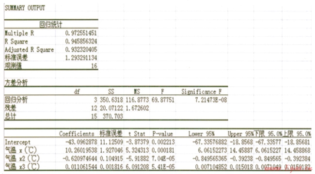 由以上分析可知,建立供氣量、氣溫對于輸差的二元方程已不可行。可考慮建立氣溫對于輸差的一元多次函數(shù)。經(jīng)嘗試一元二次、三次、四次等多種函數(shù)模型后,找到氣溫對于輸差的最優(yōu)一元三次回歸方程。其回歸分析結(jié)果如下: