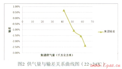 (3)在現(xiàn)有數(shù)據(jù)基礎(chǔ)上,暫未發(fā)現(xiàn)供氣量與輸差之間的明顯函數(shù)關(guān)系。但是,從圖8觀察發(fā)現(xiàn),輸差曲線1、2、3(修正)對應(yīng)的供氣量依次為:41—45、56—60、61—66,單位千萬立方米。隨著供氣量的大幅上升,輸差曲線呈向左下方平移的趨勢。即溫度等其他條件一定的情況下,隨著供氣量的大幅增加,輸差有減小的趨勢。初步分析,可能是由規(guī)模效應(yīng)導致。此推斷是否成立有待進一步的研究,可做為下一研究課題。