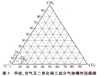 根據(jù)以上實(shí)驗(yàn)結(jié)果,繪制了CH4、CO2及空氣3組分氣體爆炸范圍圖,如圖3所示。經(jīng)檢測(cè)得知可燃?xì)釩H4在含有10%(體積分?jǐn)?shù)) CO2的混合空氣中的爆炸下限和上限分別為(X1、X2)、(X1’、X2’),三角形X1X2C即為CH4、CO2及空氣3組分氣體爆炸范圍。