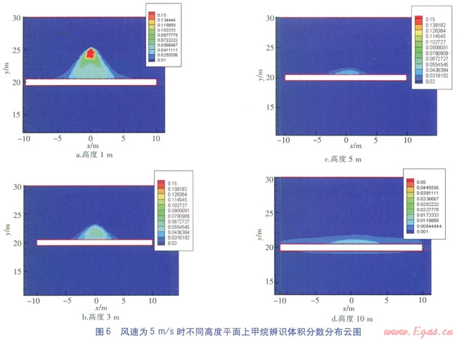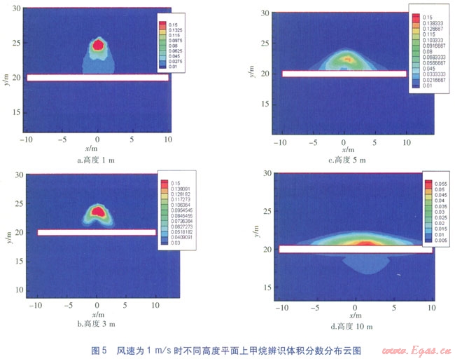 由圖6可知,當風速增大至5m/s時,在z=1m平面上,障礙物近壁面甲烷辨識體積分數(shù)聚積寬度達到l0m,危險體積分數(shù)范圍分布高度比風速為1m/s時有所降低,約在5m以下。雖然在z=10m處仍可觀測到甲烷辨識體積分數(shù),但不足以構(gòu)成威脅。