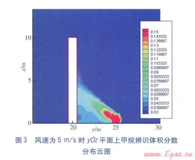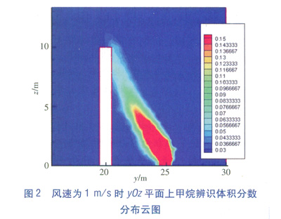 不同風速下yOz平面上甲烷辨識體積分數(shù)分布云圖(視線方向為x軸負方向)見圖2~4。由圖2可知,當風速為1m/s時,障礙物迎風面危險體積分數(shù)范圍分布在7~10m高度范圍內(nèi)。當風速為5m/s時,分布在0~5m高度范圍內(nèi)。當風速為l0m/s時,分布在0~3m高度范圍內(nèi)。