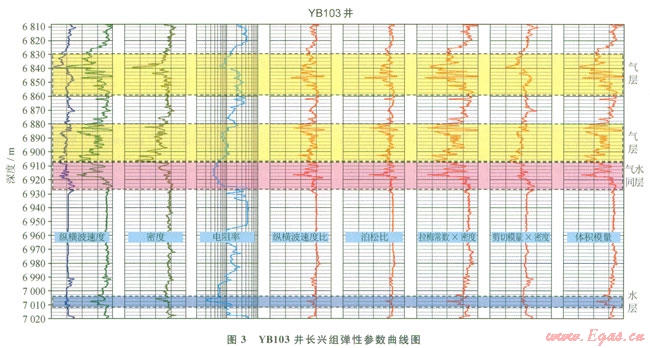 利用該技術(shù)完成了元壩氣田東部區(qū)域的氣水檢測,從識別的結(jié)果來看,與實鉆井的測試情況基本一致,也證實了該方法在該地區(qū)的有效性。圖5為該區(qū)過YBl04、YBll、YBl23、Ybl0cl井連井氣水識別剖面圖。其中YBl04測試獲得氣123×104m3/d,YBll測試獲得氣51×104m3/d,YBl23測試獲得氣5.3×104m3/d,水290m3/d,Ybl0cl測試獲得氣107×104m3/d,從圖5中可以看到,從產(chǎn)氣的YBl04井、YBll井到處于氣水過渡帶的YBl23井,穿過一段灘,間水區(qū)然后一直到產(chǎn)氣的YB10cl井,其氣區(qū)、水區(qū)分布帶及過渡帶清晰,與實鉆情況吻合好。