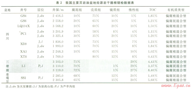 藻類勃發(fā)就是浮游藻類在一定條件和時期形成單屬種的極度生長和富集,具有強(qiáng)烈的排他性。浮游藻類分布極其廣泛,地球表面只要有水的地方,一般都有其蹤跡。藻類勃發(fā)在現(xiàn)代海洋和湖泊往往呈現(xiàn)季節(jié)性,主要類型為硅藻、顆石藻和溝鞭藻等[20]。影響藻類勃發(fā)的因素主要有光照、水溫、營養(yǎng)鹽供給、pH值和溶解氧等,其中前3個因素最為重要[21-23]。藻類勃發(fā)能在短時間內(nèi)產(chǎn)生大量有機(jī)質(zhì)聚集,具有極高的生產(chǎn)力,其直接后果是形成藻類沉積紋層。我國主要優(yōu)質(zhì)烴源巖均發(fā)現(xiàn)藻類富集,如渤海灣盆地古近系沙河街組油頁巖中保存有大量層狀藻類體、結(jié)構(gòu)藻類體和藻屑體,且地球化學(xué)分析表明藻類是原油的直接來源[24];鄂爾多斯盆地上三疊統(tǒng)長7段油頁巖的有機(jī)質(zhì)來源以藻類為主,陸源高等植物等貢獻(xiàn)十分有限[25];松遼盆地上白堊統(tǒng)青一段湖相富有機(jī)質(zhì)泥頁巖以藻類為有機(jī)質(zhì)主要來源[26];四川盆地下志留統(tǒng)龍馬溪組產(chǎn)氣頁巖也以藻類為主要生烴來源。筆者等對我國主要致密油產(chǎn)層的烴源巖進(jìn)行了取樣分析,發(fā)現(xiàn)致密油普遍高產(chǎn)的準(zhǔn)噶爾和三塘湖盆地的蘆草溝組烴源巖有機(jī)質(zhì)類型以偏腐泥混合型為主,藻類占主導(dǎo)的腐泥組含量較高,一般大于65%;而致密油普遍低產(chǎn)的四川盆地下侏羅統(tǒng)烴源巖有機(jī)質(zhì)類型以偏腐殖混合型為主,腐泥組含量偏低,一般小于30%(表2)。