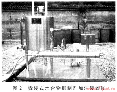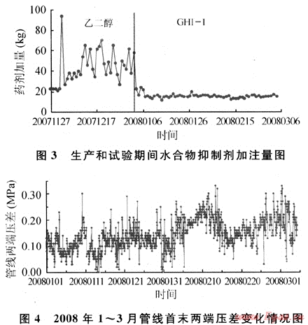 由于該天然氣水合物形成溫度較高(7.0MPa輸壓條件下的水合物形成溫度為18.60℃),投產(chǎn)初期井站節(jié)流閥、分離器等地面設(shè)備、生產(chǎn)管線及下游井站閥門、分離器、匯管和埋地管線經(jīng)常發(fā)生水合物堵塞現(xiàn)象,特別是在氣溫較低的冬季。每次冰堵后只能采取熱水淋、放空泄壓、清管通球等措施解堵,每3~5d必須清管通球1次,每次清管發(fā)現(xiàn)管內(nèi)有大量固體水合物。為保證該生產(chǎn)管線正常生產(chǎn),從2005年12月21日開始,冬季生產(chǎn)過程中采取加注乙二醇防凍劑,每天間歇式加注45~60kg。