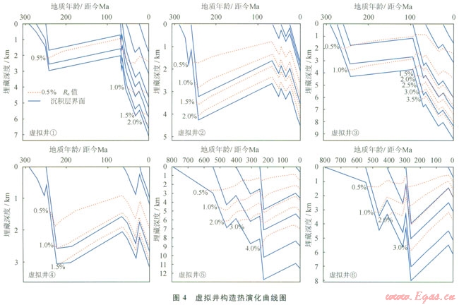 在盆地構(gòu)造熱演化史研究中,經(jīng)典和主要的盆地構(gòu)造熱演化史研究方法有:有機(jī)質(zhì)成熟度指標(biāo)[23-24]、礦物裂變徑跡、單井EASY%R。熱反演法[25-28]及(UTh)/He年齡法[29]等,實(shí)際研究中基于所能獲得的資料豐富程度及研究目的不同采用不同的方法。