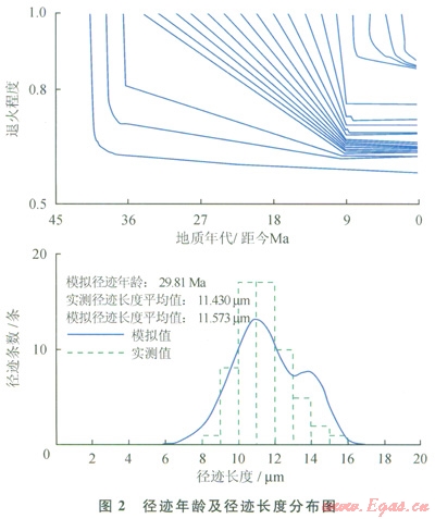 磷灰石裂變徑跡法的熱史模擬步驟為:①根據(jù)已有熱參數(shù)資料,給出熱史約束條件;②設(shè)定大量的溫度時(shí)間曲線,通過正演求出徑跡長(zhǎng)度、徑跡年齡模擬值;③將正演結(jié)果與實(shí)測(cè)徑跡長(zhǎng)度、年齡進(jìn)行比較,獲得最佳模型,即得到熱史模擬結(jié)果。
