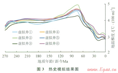 熱史模擬結(jié)果(圖3)表明:南黃海古地溫梯度自二疊系沉積開始至上白堊紀(jì)(距今約70Ma)一直呈上升趨勢(shì),最高至5.0℃/l00m,其間有2次快速升高(距今270~260Ma和130~70Ma)和1個(gè)平穩(wěn)期(距今260~130Ma),平穩(wěn)期地溫梯度在4.0℃/l00m左右,70Ma至今地溫梯度總體呈下降趨勢(shì),現(xiàn)今地溫梯度最低,為3.0℃/l00m左右;在最高地溫梯度處(距今約70Ma),各虛擬井的數(shù)值差別最大,最大差別可達(dá)1.0℃/l00m;新近紀(jì)和第四紀(jì)沉積對(duì)古生界烴源巖的深埋增熟作用由于該時(shí)期地溫梯度的降低而減弱。