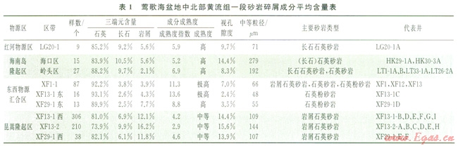 表1顯示,盆地中北部黃流組一段時(shí)期總體上以石英砂巖類為主,但不同區(qū)帶的長(zhǎng)石、巖屑含量有差異。鶯東斜坡??趨^(qū)、嶺頭區(qū)長(zhǎng)石平均含量介于9.7%~10.5%,巖屑平均含量介于2.8%~5.8%,以長(zhǎng)石石英砂巖為主,反映以花崗巖為主的海南隆起區(qū)物源性質(zhì);西北部的LG20-1構(gòu)造,其石英、長(zhǎng)石、巖屑含量與鶯東斜坡???、嶺頭區(qū)相近,仍以長(zhǎng)石石英砂巖為主,但其粒度偏細(xì)(平均粒度中值為71mm),為極細(xì)砂,反映離物源區(qū)較遠(yuǎn),從其地理位置來看應(yīng)屬紅河物源體系;XFl3-2氣田、XFl3-1氣田西部、XF29-1構(gòu)造西部則以巖屑石英砂巖較為多見,巖屑平均含量介于11.8%~l6.2%(主要為片巖、千枚巖、變質(zhì)砂巖),中等成分成熟度,反映西部昆嵩隆起區(qū)含較多變質(zhì)巖類物源特征;而XFl、XFl2、XFl3、XFl3-1C、XF29-1D井砂巖,粒度細(xì)(粒度中值介于48~66mm),長(zhǎng)石、巖屑含量低,平均含量分別為2.5%~3.8%、3.9%~7.7%,石英含量極高(大于90%),多為石英粉砂巖,成熟度指數(shù)介于8.8~13.6,屬高極高成分成熟度,反映這些井區(qū)沉積物經(jīng)過較長(zhǎng)距離的搬運(yùn)。