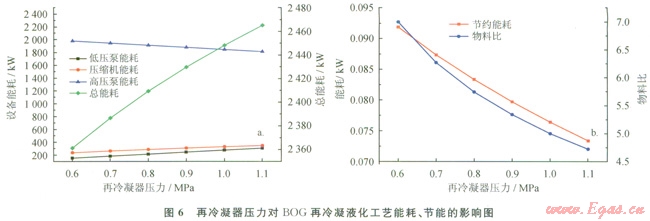 再冷凝器壓力對BOG再冷凝液化工藝能耗、節(jié)能的影響見圖6。從圖6可以看出,隨著再冷凝器壓力的升高,即低壓泵和壓縮機(jī)壓力的升高,BOG再冷凝液化工藝所消耗的能量相應(yīng)增加,則BOG再冷比增加,當(dāng)LNG接收站處于外輸量最小工況時(shí),操作困難。因此,在實(shí)際生產(chǎn)中,再冷凝器的壓力一般控制在0.7~O.9MPa[8]。