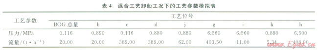 模擬混合工藝卸船工況下的流程參數(shù)見表4,在卸船工況下再冷凝器入口的LNG流量為62.00 t/h,在再冷凝器安全運(yùn)行的同時(shí),盡可能降低高壓壓縮機(jī)的入口流量,從而節(jié)約總能耗。低壓壓縮機(jī)設(shè)計(jì)負(fù)荷為6.7t/h,為統(tǒng)一設(shè)備運(yùn)行參數(shù),并節(jié)約投資成本,再冷凝器入口LNG流量的設(shè)定以滿足高壓壓縮機(jī)入口BOG流量小于6.7t/h為限。