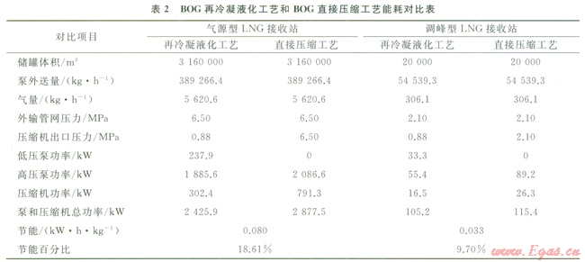 用HYSYS軟件對氣源型LNG接收站和調(diào)峰型LNG接收站分別采用再冷凝液化和直接壓縮的BOG處理工藝進(jìn)行了模擬計(jì)算(氣源型LNG接收站按青島LNG接收站設(shè)計(jì)參數(shù)進(jìn)行模擬),模擬圖分別見圖1、2,能耗對比結(jié)果見表2??梢钥闯?,無論是對調(diào)峰型LNG接收站還是氣源型LNG接收站,BOG再冷凝液化工藝都比BOG直接壓縮工藝更為節(jié)能。