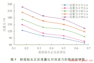 當(dāng)流量不變時(shí),射流鉆頭的正反流量比對(duì)自進(jìn)力的影響就顯得比較重要。通過(guò)實(shí)驗(yàn)測(cè)量發(fā)現(xiàn),射流鉆頭所產(chǎn)生的自進(jìn)力隨著正反流量比的增大而減小,近似呈線性關(guān)系變化(圖5)。以噴距為10mm,井筒直徑為49mm,流量為0.99L/s時(shí)為例,正反流量比為2/3的射流鉆頭所產(chǎn)生的自進(jìn)力為133.2N;正反流量比為l/2的射流鉆頭所產(chǎn)生的自進(jìn)力為171.9N;正反流量比為l/3的射流鉆頭所產(chǎn)生的牽引力為188.5N;正反流量比為l/6的射流鉆頭產(chǎn)生所產(chǎn)生的牽引力為228.1N。這是因?yàn)殡S著正反流量比的減小,反向射流的流量分配比例增大,反向射流所產(chǎn)生的反推力也增大,同時(shí)反向射流的降壓效應(yīng)也越明顯,故可以產(chǎn)生更大的自進(jìn)力。在實(shí)驗(yàn)條件下,射流鉆頭流量比從1/6增大到1/3,排量在0.71~0.99L/s時(shí)范圍,所產(chǎn)生的自進(jìn)力范圍為67.8~228.1N。