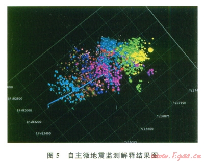 通過實(shí)時微地震監(jiān)測技術(shù)的應(yīng)用,對于完成壓裂施工、優(yōu)選射孔井段、優(yōu)化參數(shù)及提高產(chǎn)能具有很好的指導(dǎo)性[12]。本地區(qū)頁巖氣水平井壓裂微地震監(jiān)測結(jié)果表明,壓裂裂縫延伸方向受地應(yīng)力與天然裂縫雙重因素控制,已實(shí)施井微地震監(jiān)測結(jié)果表明實(shí)現(xiàn)了形成復(fù)雜裂縫網(wǎng)絡(luò)的體積壓裂目標(biāo),表明水平井分段體積壓裂工藝可滿足頁巖氣水平井改造要求(圖5)。