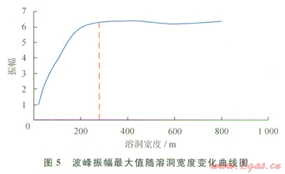 2)當(dāng)溶洞寬度小于菲涅爾帶半徑時,溶洞越寬其對應(yīng)振幅越大;當(dāng)溶洞寬度大于菲涅爾帶半徑時溶洞寬度對振幅影響不大;隨著溶洞寬度的增加,其對應(yīng)振幅最終逼近于一個極值。
