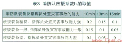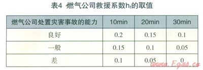 消防隊對燃氣事故的降災作用,表現(xiàn)為消防隊的反應時間和消防隊的裝備及指揮人員的對災害事故的處置能力兩個方面。結合我國消防隊到達現(xiàn)場所用的一般時間標準以及消防救援裝備和指揮能力評判,消防隊救援系數(shù)hf的取值見表3。