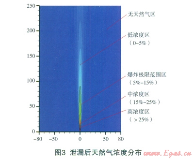 天然氣中高壓輸送管道泄漏后,無風條件下,在大氣中以射流的方式存在(如圖3所示)。根據(jù)其爆炸性,可以分為4個區(qū)域:(1)高天然氣濃度區(qū):當空氣中天然氣濃度達25%~30%時,可引起頭痛、頭暈、乏力、注意力不集中、呼吸和心跳加速、共濟失調。若不及時脫離,可致窒息死亡。當濃度大于30%,在較短的時間內(nèi)就會窒息死亡;(2)中濃度區(qū)(15%~25%);(3)爆炸極限范圍區(qū)(5%~15%):在該濃度范圍內(nèi),遇熱源、明火或其它點火源有燃燒爆炸危險;(4)低天然氣濃度區(qū):