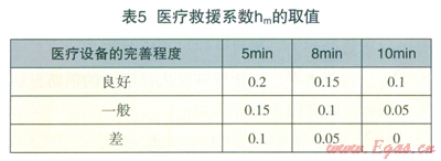 醫(yī)療機構對燃氣事故的降災作用,表現(xiàn)為醫(yī)療機構到達現(xiàn)場的急救反應時間和醫(yī)療設備的完善程度兩個方面。根據(jù)急救時對傷者的救治效果,表示醫(yī)療救援系數(shù)的取值見表5。
