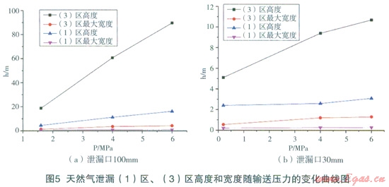 DN900在運行壓力6.0MPa,輸氣能力為74.3萬m3/h的高壓天然氣輸送管道(管壁厚度l0mm),埋地深度1.2m,泄漏點孔徑30mm時,天然氣泄漏口速度較大,屬超聲速天然氣氣流在空氣中的射流擴散,因此,在高度方向的擴散遠大于在水平方面的擴散。如圖4所示,在泄漏5s時,天然氣高度已達150m;25s天然氣已擴散至大于250m的高空;50s其在250m下的空間擴散形狀趨于定常,即形狀隨時間推移基本一致。圖5給出了泄漏口l00mm、30mm條件下天然氣泄漏(1)區(qū)、(3)高度和寬度隨輸送壓力的變化曲線圖。從模擬計算結果可以看出,隨著輸送壓力的增大,在相同泄漏口條件下,泄漏天然氣流量增大,導致(1)區(qū)、(3)高度和寬度增大。圖6給出了天然氣泄漏(1)區(qū)、(3)高度和寬度隨泄漏口直徑的變化趨勢圖,圖中表明:在相同輸送壓力下,泄漏口直徑增大,相當于泄漏天然氣流量增大,導致(1)區(qū)、(3)高度和寬度增大。