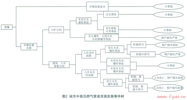 城市燃氣管道一旦發(fā)生泄漏,如果人為控制得當,將會安全泄放,僅造成較小的經(jīng)濟損失;如果破損孔洞較大、管道壓力大造成泄漏未被及時控制,遇到點火源將會發(fā)生爆炸、火災事故。通過對搜集的百余例城市中高壓燃氣管道事故發(fā)展過程的統(tǒng)計分析,構建如圖2所示城市中高壓燃氣管道泄漏發(fā)展事件樹。城市中高壓燃氣管道泄漏災害性事故共分5個階段:泄漏,早期處置失敗,人員未被及時疏散,發(fā)生火災、爆炸等次生災害,控制、救援不得當。