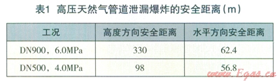 考慮到風速以及環(huán)境條件對天然氣泄漏擴散的影響,高度方向保守安全系數(shù)為2,水平方向保守安全系數(shù)取為4,則高壓天然氣管道泄漏爆炸的最小安全距離如表l所示。而在天然氣泄漏點源的常年風向下風向位置,水平方向的安全距離則應適當增大。