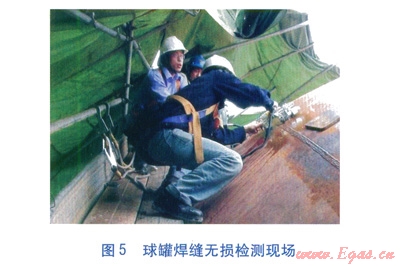由特種設(shè)備檢測(cè)機(jī)構(gòu)對(duì)球罐進(jìn)行全面檢測(cè)。檢測(cè)項(xiàng)目包括宏觀檢測(cè)、壁厚測(cè)定、焊縫無(wú)損檢測(cè)、安全附件檢測(cè)等。焊縫無(wú)損檢測(cè)包括超聲波檢測(cè)、射線檢測(cè)、磁粉檢測(cè)、滲透檢測(cè)等。球罐焊縫無(wú)損檢測(cè)現(xiàn)場(chǎng)見(jiàn)圖5。