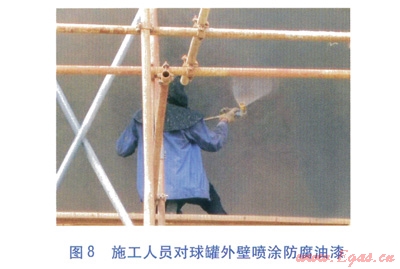 為保證球罐外壁的防腐質(zhì)量,要求對(duì)球罐外壁進(jìn)行噴砂除銹處理,除銹等級(jí)達(dá)到Sa2.5級(jí)(非常徹底的噴射或拋射除銹)。施工人員對(duì)球罐外壁進(jìn)行噴砂除銹、噴涂防腐油漆分別見(jiàn)圖7、8。