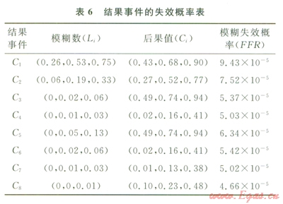首先邀請有經(jīng)驗的專家組成評價小組,冉對專家進(jìn)行權(quán)重分析,本文僅以兩位專家為例,并且賦予其相等的權(quán)重。依據(jù)故障樹中基本事件和事件樹中誘發(fā)事件的風(fēng)險大小,由號家賦予每個事件相應(yīng)的三角模糊數(shù),評價結(jié)果見表4,然后根據(jù)式(5)求得聚合后的事件模糊數(shù)。