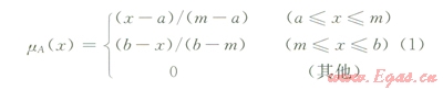 式中A是指定論域x上的模糊集;mA(x)是指工對模糊集A的隸屬函數(shù);m為模糊數(shù)A的均值;a、b分別為模糊數(shù)A的左右分布參數(shù)。