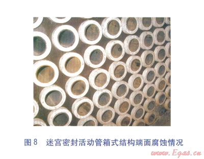 經(jīng)研究,認(rèn)為采用非金屬材料的迷宮密封結(jié)構(gòu)可以有效消除縫隙腐蝕的發(fā)生,迷宮密封活動管箱式結(jié)構(gòu)見圖7。鍍搪瓷鋼管穿入迷宮密封套中(內(nèi)環(huán)面加工有迷宮鋸齒槽),迷宮鋸齒槽與鋼管外表面形成若干道迷宮腔,從而實現(xiàn)了密封。迷宮密封活動管箱式結(jié)構(gòu)不但具有端面填料函密封的活動管箱式結(jié)構(gòu)的優(yōu)點,還由于換熱管與箱體板之間有柔性迷宮密封套隔離,避免了在安裝、運行過程中對搪瓷層的破壞,從本質(zhì)上消除了縫隙腐蝕的發(fā)生[5]。經(jīng)技術(shù)改造后的空氣預(yù)熱器,連續(xù)運行2年后運行狀況依然良好,箱體板及換熱管各部位基本上沒有發(fā)生腐蝕(見圖8、9)。