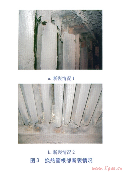 根據(jù)以上分析,課題小組選用抗腐蝕性能較高的ND鋼(09CrCuSb)對換熱管進(jìn)行改造,仍采用整體焊接的固定管箱式結(jié)構(gòu)。但改造后,5~10個月?lián)Q熱管根部再次出現(xiàn)了斷裂。不但使用壽命沒有有效延長,而且由于ND鋼的價格較高,導(dǎo)致成本急劇增加。