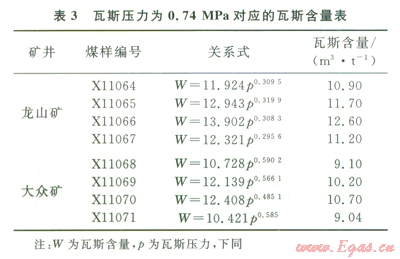 3)實驗室研究了瓦斯含量和瓦斯壓力的相互關(guān)系,龍山礦無煙煤瓦斯壓力0.74MPa對應(yīng)的瓦斯含量為l0.9~12.6m3/t,最低為l0.9m3/t;大眾礦貧煤對應(yīng)的瓦斯含量為9.04~10.7m3/t,最低為9.04m3/t。