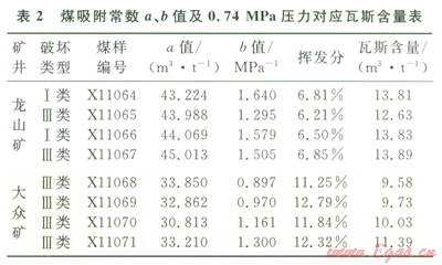 采用WY-98B型全自動瓦斯吸附常數(shù)測定儀,測定了龍山礦和大眾礦的吸附常數(shù)a、b值和揮發(fā)分等參數(shù),測試結(jié)果見表2。