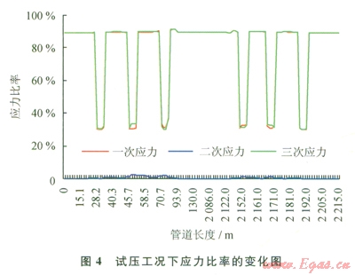 3)一次應(yīng)力占管道綜合應(yīng)力的97.12%,故占管道應(yīng)力的大部分。同時(shí),在管道自重對(duì)一次應(yīng)力影響的校核中,管道自重占一次應(yīng)力的8.9%,所占比例較小。因此,管道內(nèi)壓是產(chǎn)生一次應(yīng)力的主要因素。在一次應(yīng)力校核中發(fā)現(xiàn)應(yīng)力集中點(diǎn)在管道彎管3處,由于一次應(yīng)力反映的是管道內(nèi)壓和管道以及管內(nèi)介質(zhì)的自重對(duì)管道應(yīng)力的影響,因此,在試壓工況下,影響管道應(yīng)力的最主要因素是管道內(nèi)壓。