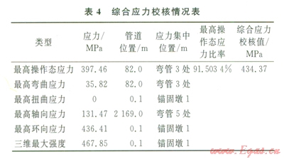 由表2~5可知,最高操作態(tài)綜合應(yīng)力產(chǎn)生在管道彎管3處,管道系統(tǒng)單元l70~180即管道76~82m處的最高操作態(tài)應(yīng)力為397.46MPa,最高操作態(tài)應(yīng)力比率為91.5034%,綜合應(yīng)力主要產(chǎn)生在彎管3處,一次、二次應(yīng)力及綜合應(yīng)力校核最高節(jié)點(diǎn)應(yīng)力均未超過(guò)434.37MPa,滿(mǎn)足管道的強(qiáng)度和柔性要求。
