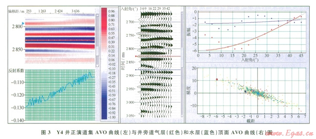 為了確定該氣田的AVO類型,首先從理論出發(fā)統(tǒng)計了井上的氣層及上覆地層的屬性參數(shù),包括縱橫波速度、密度、泊松比等參數(shù),并通過Shuey’S的簡化Zoeppritz方程計算了反射系數(shù),發(fā)現(xiàn)氣層頂面的反射系數(shù)大,而泊松比變化較小[15],滿足產(chǎn)生第Ⅳ類異常的條件;接著選擇代表性的井(Y4井)進(jìn)行了正演模擬,模擬結(jié)果顯示該井正演道集的氣層頂面均對應(yīng)波谷(負(fù)反射系數(shù)),并且隨著偏移距的增加振幅逐漸減弱(圖3左);隨后對Y4井旁的實際地震道集進(jìn)行了AVO分析(網(wǎng)3右),從實際道集中提取的氣層頂面AVO曲線表明:在偏移距200~4500 m的變化范圍內(nèi),反射系數(shù)均為負(fù)值,并且其絕對值隨著偏移距的增大而減小,與正演模擬結(jié)果吻合,證實了該氣藏的IV類AVO特征。