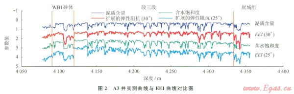圖2為相應(yīng)角度的EEI曲線與實測的泥質(zhì)含量曲線(Vsh)、含水飽和度(Sw)曲線的比較圖,從圖2中可以看出,EEI(30°)與泥質(zhì)含量曲線具有很好的一致性,而EEI(25°)與含水飽和度曲線具有很高的相似度,氣田內(nèi)的其他井也具有類似的情況。