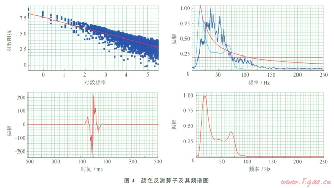尋找合適的操作算子是顏色反演的關(guān)鍵,其具體方法是利用工區(qū)內(nèi)一組井的聲阻抗擬合一條“理想”的輸出阻抗譜,利用井旁一組地震道求取平均地震譜。從以上兩個頻譜可以求取操作算子的頻譜,使得地震譜形狀在地震頻帶內(nèi)轉(zhuǎn)換為阻抗譜。