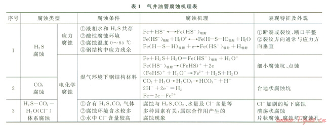 氣井大修過程中起m油管腐蝕檢測(cè)及分析結(jié)果表明,靖邊氣田氣井油管電化學(xué)腐蝕與應(yīng)力腐蝕同時(shí)存在,但主要發(fā)生由H2S—CO2—H2O(C1—)體系引起的電化學(xué)腐蝕[2],見表1。