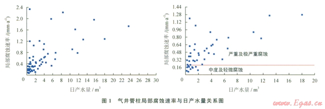 根據(jù)歷年油管腐蝕測(cè)試結(jié)果,結(jié)合氣井產(chǎn)水量對(duì)應(yīng)的最大局部腐蝕速率的影響(圖1),可以看出,氣井油管腐蝕程度與氣井產(chǎn)水量關(guān)系密切,氣井腐蝕速率隨著氣井產(chǎn)水量的增加而增長(zhǎng)。中度及輕微腐蝕氣井主要分布于日產(chǎn)水量小于2m3的氣井,嚴(yán)重和極嚴(yán)重腐蝕氣井主要分布于日產(chǎn)水量大于2m3的產(chǎn)水氣井。