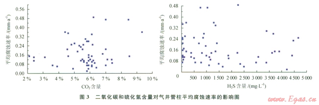 CO2和H2S含量對(duì)氣井管柱腐蝕速率的關(guān)系如圖3所示。CO2含量大于4%時(shí),油管腐蝕速率隨CO2升高而上升。由于H2S含量比較低,其對(duì)管柱腐蝕的影響很小。