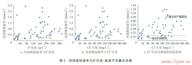 根據(jù)歷年油管腐蝕檢測(cè)結(jié)果,結(jié)合氣井產(chǎn)水量與氣井產(chǎn)出水礦化度和Cl含量對(duì)應(yīng)局部腐蝕速率的關(guān)系見圖2。