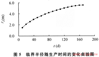 計(jì)算的臨界半徑隨時(shí)間推移曲線如圖5。表明生產(chǎn)時(shí)間越長(zhǎng)臨界半徑越大,水相蒸發(fā)的影響范圍越深,但是當(dāng)生產(chǎn)時(shí)間超過(guò)一定值后(120d),臨界半徑趨于定值,水相蒸發(fā)作用逐漸變緩。