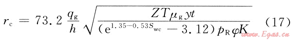 當(dāng)含水飽和度降低到束縛水飽和度時(shí),氣相滲透率達(dá)到最大。定義此時(shí)含水飽和度對(duì)應(yīng)的徑向距離為臨界半徑,則隨著生產(chǎn)時(shí)間的延長(zhǎng)和壓力的降低,臨界半徑由井筒附近逐漸向地層伸出推移,對(duì)應(yīng)的臨界半徑推移計(jì)算公式為: