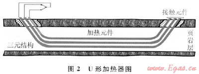 引入導(dǎo)線將加熱元件耦聯(lián)到地層表面上。加熱元件耦聯(lián)到位于地層的底層上或附近的接觸元件。接觸元件耦聯(lián)到接觸部分中的接觸器上,以使支腿間彼此電氣耦聯(lián)以形成三元結(jié)構(gòu)。三元結(jié)構(gòu)耦聯(lián)到水平連接井。該加熱器的優(yōu)點(diǎn)是電氣耦聯(lián)多樣化,較易實(shí)施,缺點(diǎn)是直線排布三元結(jié)構(gòu)不利于加熱頁巖層。 2.2 電加熱井的設(shè)計(jì)