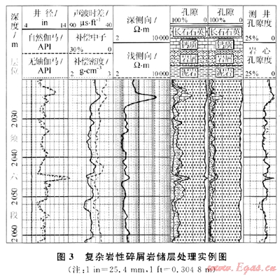 復(fù)雜巖性碳酸鹽巖儲層處理模塊是在雙礦物解釋程序發(fā)展起來的一個處理模塊,它考慮了中子曲線的含氣校正、聲波時差與孔隙度的非線性關(guān)系、巖性三角形的非正規(guī)排列等多個因素,使其更適用于一般碳酸鹽巖儲層的處理。
