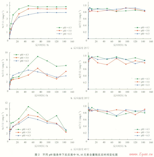 1)反應(yīng)溫度不同時,反應(yīng)溫度越高,Si元素的溶出量越大;隨溫度升高,Al元素的溶出量變化不大。溶液pH值和溫度相同時,隨反應(yīng)時間增加,反應(yīng)液中Si元素含量先增加后減小,有一定的振蕩。溫度為45℃時,反應(yīng)中si元素含量在48h時左右達(dá)到最大值,溫度為35℃時,反應(yīng)液中Si元素含量在72h左右達(dá)到最大值,溫度為25℃時,Si元素含量在96 h左右達(dá)到最大值;Al元素含量隨反應(yīng)時間增加迅速增加,并趨于穩(wěn)定。