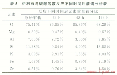 在45℃條件下,伊利石與pH值為4.3的碳酸溶液反應(yīng)不同時間后,伊利石能譜測試結(jié)果見表5,圖3。