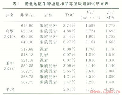 從表l可見,3件樣品有機碳含量小于1.5%,平均蘭氏體積(VL)為1.79m3/t,平均蘭氏壓力(pL)為1.32MPa;10件樣品有機碳含量大于1.5%,平均VL為3.12m3/t,平均pL為l.34MPa。綜合上述測試結果,牛蹄塘組頁巖模擬最大吸附能力平均為3.12m3/t。