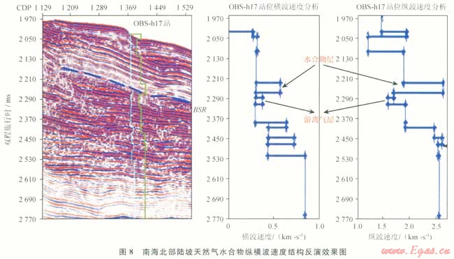 盡管橫波的整體成像效果尚無法與縱波相比,但其走時信息可用于縱橫波速度聯(lián)合反演以獲得HF-OBS所在位置較可靠的縱波和橫波速度,進而進行定量分析并確定水合物存在與否。圖8為HF-OBShl7站位的速度反演結(jié)果。縱橫波速度在BSR上部明顯增大,縱波速度值介于1788~2742m/s,增幅為420~1090m/s;橫波速度介于400~600m/s,增幅為200~260m/s,反映水合物礦體的存在。淺部的縱波速度急劇下降而橫波幾乎沒有變化,表明此處存在淺部游離氣或游離氣運移通道。從圖8可以看出,HF-OBS反演速度的垂向分辨率比傳統(tǒng)的速度譜分辨率有了很大的提高,充分揭示了天然氣水合物的縱、橫波速度結(jié)構(gòu),并且速度結(jié)構(gòu)異常與BSR及水合物礦體的分布層位有很好的對應關系[18],從而增強了對水合物礦體的分辨能力。